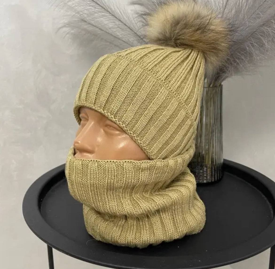 💙вязана утеплена флісом по всій довжині шапка і хомут на флісі